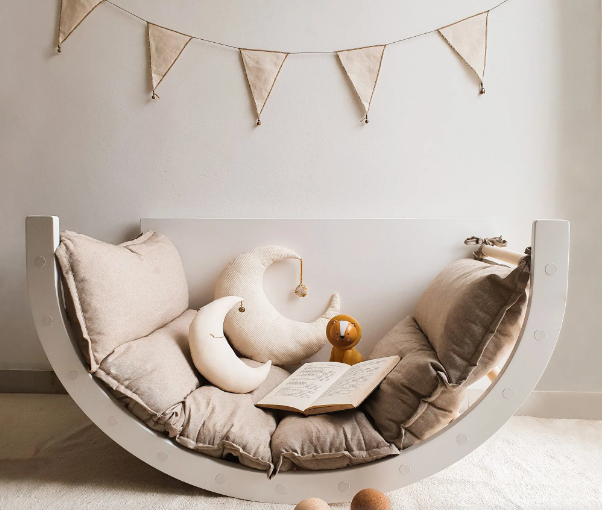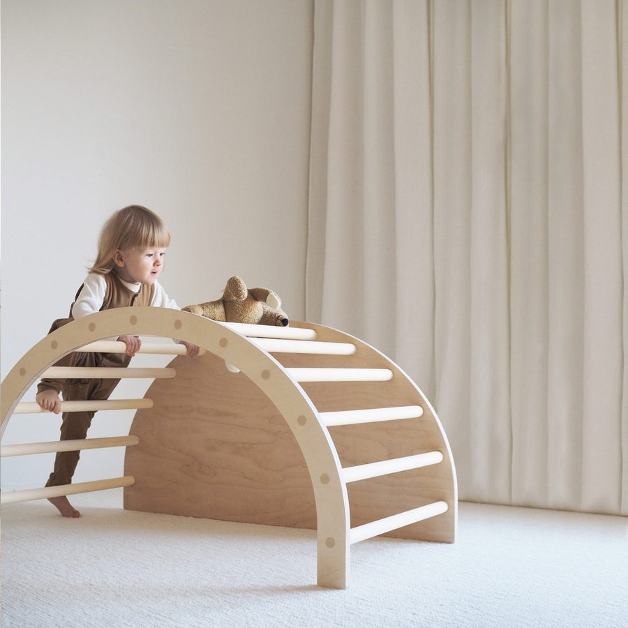Oltre ad arrampicarsi, ha molte altre funzioni. Può essere utilizzato come sedia a dondolo, angolo giochi, tappeto da gioco, porta da calcio, tavolo per bambini, portagiochi o tavolino. Il cuscino rende più sicuro e confortevole l'utilizzo dell'arco come sedia a dondolo.