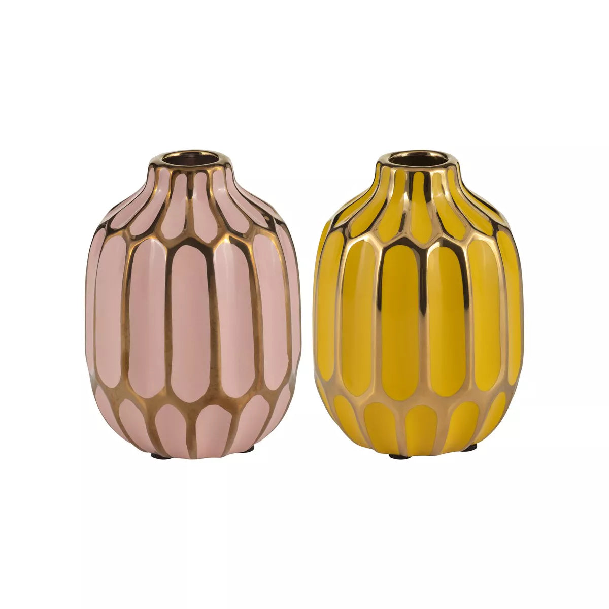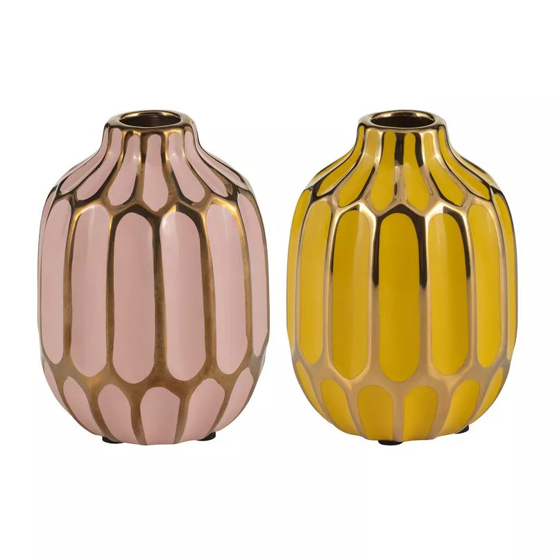 This vase set includes a pair of vases in a matching style, small rounded vases with an indented design. One comes in blush pink while the other comes in a deep yellow. Both are accented with metallic gold.