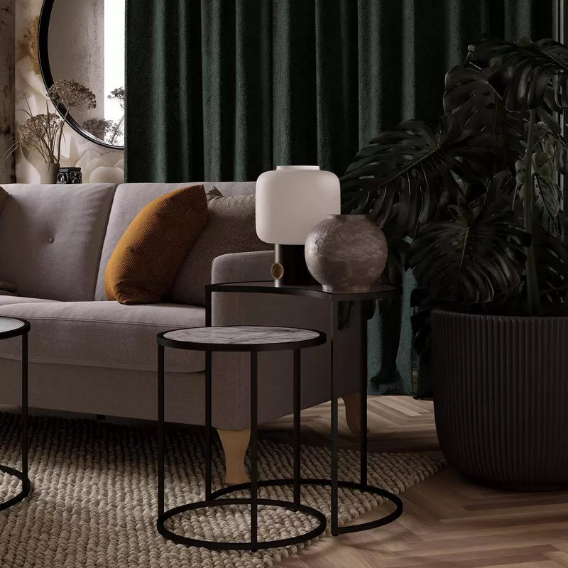 Molte lune fa abbiamo iniziato un viaggio fuori dal mondo per portare i nostri concetti di design direttamente dalla nostra immaginazione nella tua casa. La Collezione Mr. Kate Moon Phase è davvero un insieme di pezzi decorativi da sogno, che prendono vita. Cornici sottili e delicate incorniciano un elegante piano in vetro scanalato a forma di mezzaluna, rivelando un piano rotondo contemporaneo in morbido marmo sintetico sul tavolo inferiore. Questo design combina il minimalismo moderno con curve lussureggianti. Progettati pensando a spazi piccoli e alla versatilità, i Tavolini Nesting Mr. Kate Moon Phases sono un’aggiunta affascinante e salvaspazio per qualsiasi stanza della casa. Uno dei tanti dettagli distintivi che rendono questi tavolini unici è la possibilità di esporli in modi infiniti, separati o insieme. Quando il tavolo rotondo opaco inferiore scorre fuori dal tavolo superiore trasparente a forma di mezzaluna, potrai guardare attraverso il vetro scanalato le diverse fasi della luna, creando un elemento di design davvero inaspettato e unico di cui non possiamo smettere di ossessionarci. Realizzati con metallo verniciato a polvere resistente, MDF e vetro temperato da 9,5 mm, i Tavolini Nesting sono solidi quanto eleganti. Decora questi tavolini unici con oggetti in legno e piante per creare un’atmosfera calda ma moderna o impreziosiscili con i tuoi accessori artistici preferiti per un look più divertente ed eclettico. Completa il cerchio e completa la collezione Moon Phases con il Consolle Moon Phases e i Tavolini da Caffè Nesting Mr. Kate. Perfetto per i tuoi stili estetici: Moderno/Drammatico, Glam, Vintage-Eclettico, Industriale, Minimalista. Non sei sicuro di definire il tuo stile? Fai il Quiz Mr. Kate What’s My Aesthetic.