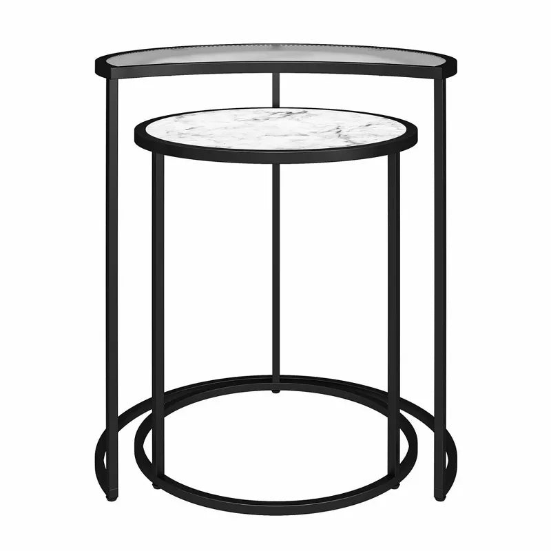 Caratterizzati da 2 tavolini terminali con cornice nera delicata e piano elegante in vetro scanalato sopra, che rivela un piano contemporaneo in marmo sintetico morbido sotto